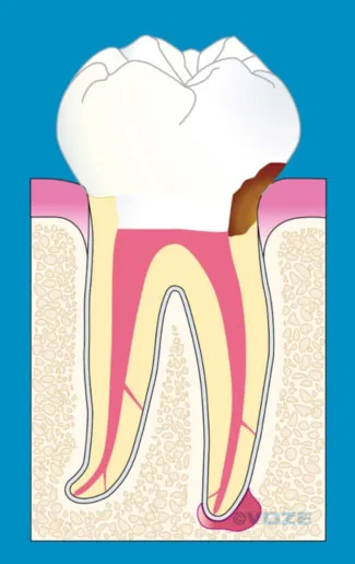 Eine erneute Infektion durch bakterielle Besiedelung des bereits gefüllten Kanalsystems kann auch auf einer Wurzelkanalfüllung beruhen, die im Speichel befindlichen Bakterien ausgesetzt ist. Karies ist hierfür ursächlich, aber auch eine zu späte Versorgung durch den Einsatz von Füllung oder Krone.